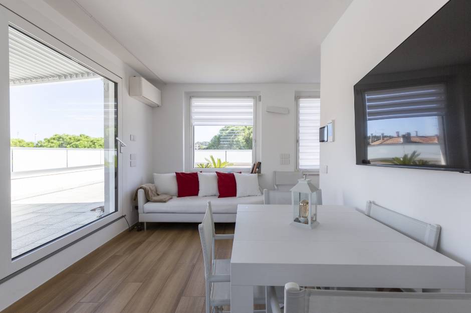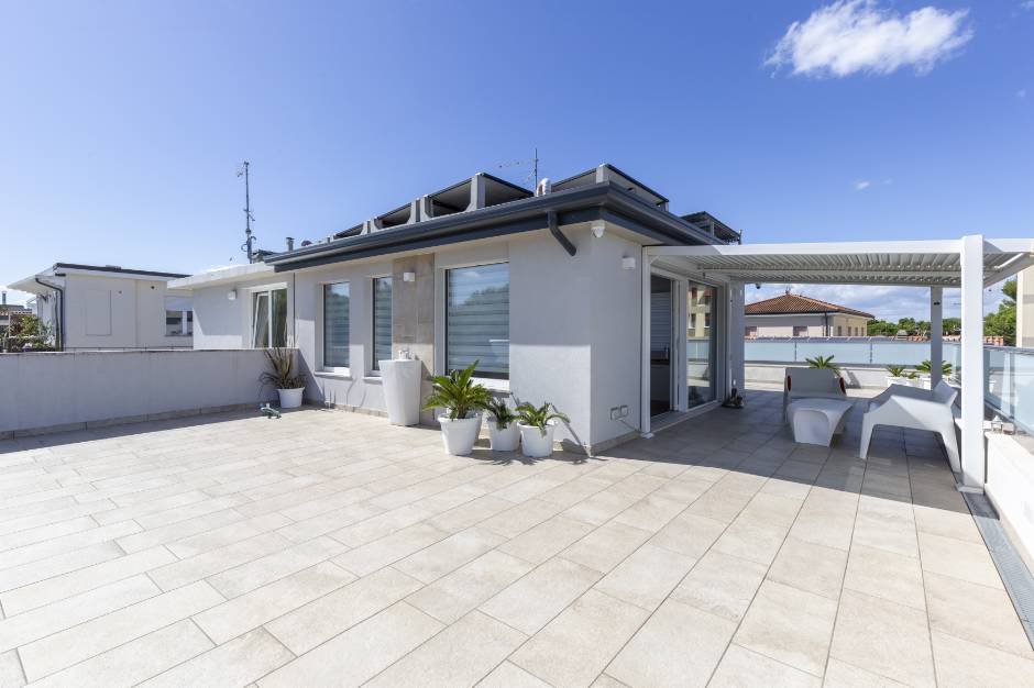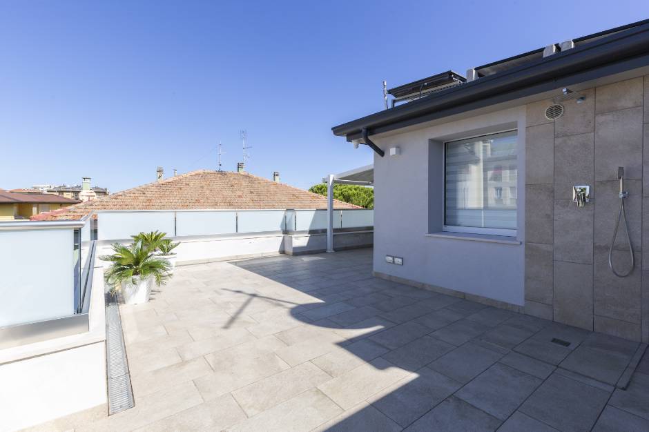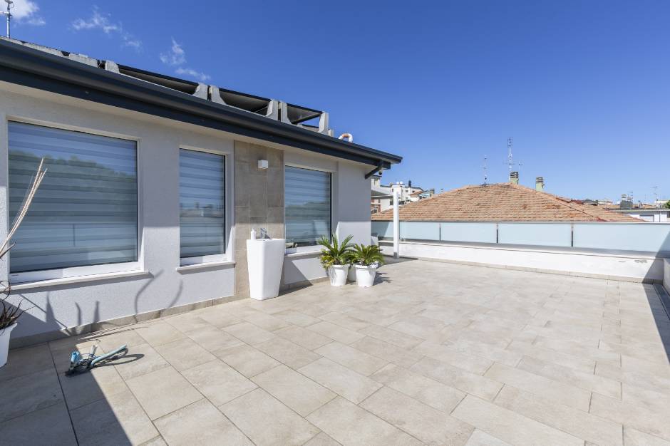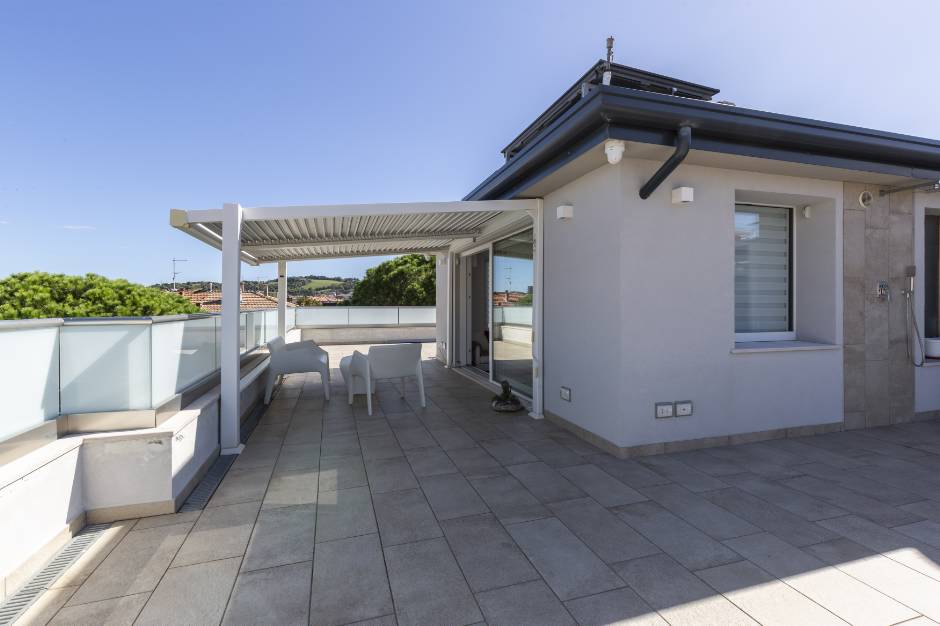 Pesaro città: zona Pantano, vendesi magnifica e moderna residenza dalle massime prestazioni energetiche con ampio terrazzo e box auto esclusivo. Al secondo e ultimo piano (no ascensore) di una palazzina di sole quattro unità appena ristrutturata con superbonus 110%, proponiamo questo esclusivo appartamento seminuovo che si sviluppa su due livelli per una superficie complessiva interna di circa 148 mq. oltre alla terrazza e al garage. La residenza si compone al primo livello di ingresso diretto su un ampio disimpegno che immette nei vari ambienti, tra cui l'ampia e luminosa zona living in open-space con camino, cucina a vista e accesso a uno dei balconi, un elegante bagno con balcone, una lavanderia e due ampie camere da letto di cui una con balcone; tramite una comoda scala, si sale al secondo livello dove troviamo un locale sottotetto utilizzato come ambiente living con angolo cottura direttamente collegato tramite una moderna vetrata scorrevole all'ampio terrazzo di 120 mq., in parte coperto da pergolato. Completa la proprietà un garage esclusivo al piano terra di circa 20 mq. con piccolo scoperto esclusivo antistante. La residenza, già libera, è stata ristrutturata nel 2021 con ottimo gusto moderno, estrema cura dei dettagli e materiali di pregio. I vari impianti tecnologici di ultimissima generazione, tra cui il riscaldamento e raffrescamento a pavimento a pompa di calore (no gas), l'aria condizionata canalizzata, i pannelli solari e pannelli fotovoltaici con accumulatori, l'impianto di domotica e la ventilazione meccanica controllata (VMC), oltre alla realizzazione del cappotto esterno, garantiscono all'immobile un elevatissimo comfort e un notevole risparmio energetico. Le utenze della proprietà sono autonome e non sono previste spese di condominio. Strategica la posizione della proprietà soprattutto per famiglie in cerca dell'abitazione principale: a due passi dal centro storico di Pesaro e soprattutto prossimo ai principali servizi cittadini e alle tante attività commerciali presenti nel quartiere, tra cui esercizi di prima necessità quali farmacie, supermercati, poste e bar-pasticcerie. Prezzo: € 500.000. Classe energetica A4 Ipe 17,98. Chiamaci subito per una visita!! al seguente recapito telefonico: 072131136.